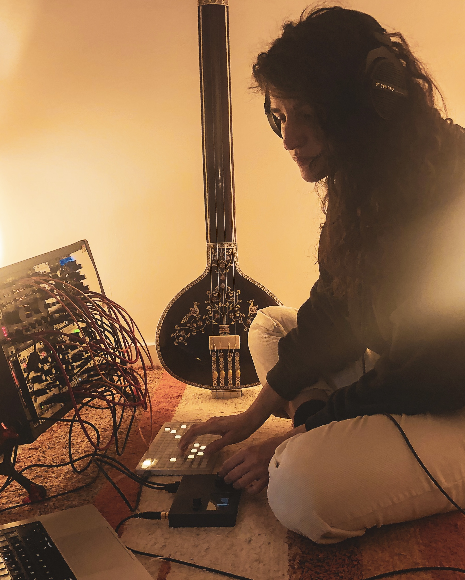 background multidisciplinar que incluye diferentes marcos y lenguajes — conceptuales en el ámbito de la conciencia, programación y arquitectura de sistemas, vivenciales a través de años de formación en la tradición de la música hindostaní clásica, prácticas de escucha profunda, creación de atmósferas sonoras inmersivas en directo, voz, cuerpo y electrónica como interfaces de relación sonora.